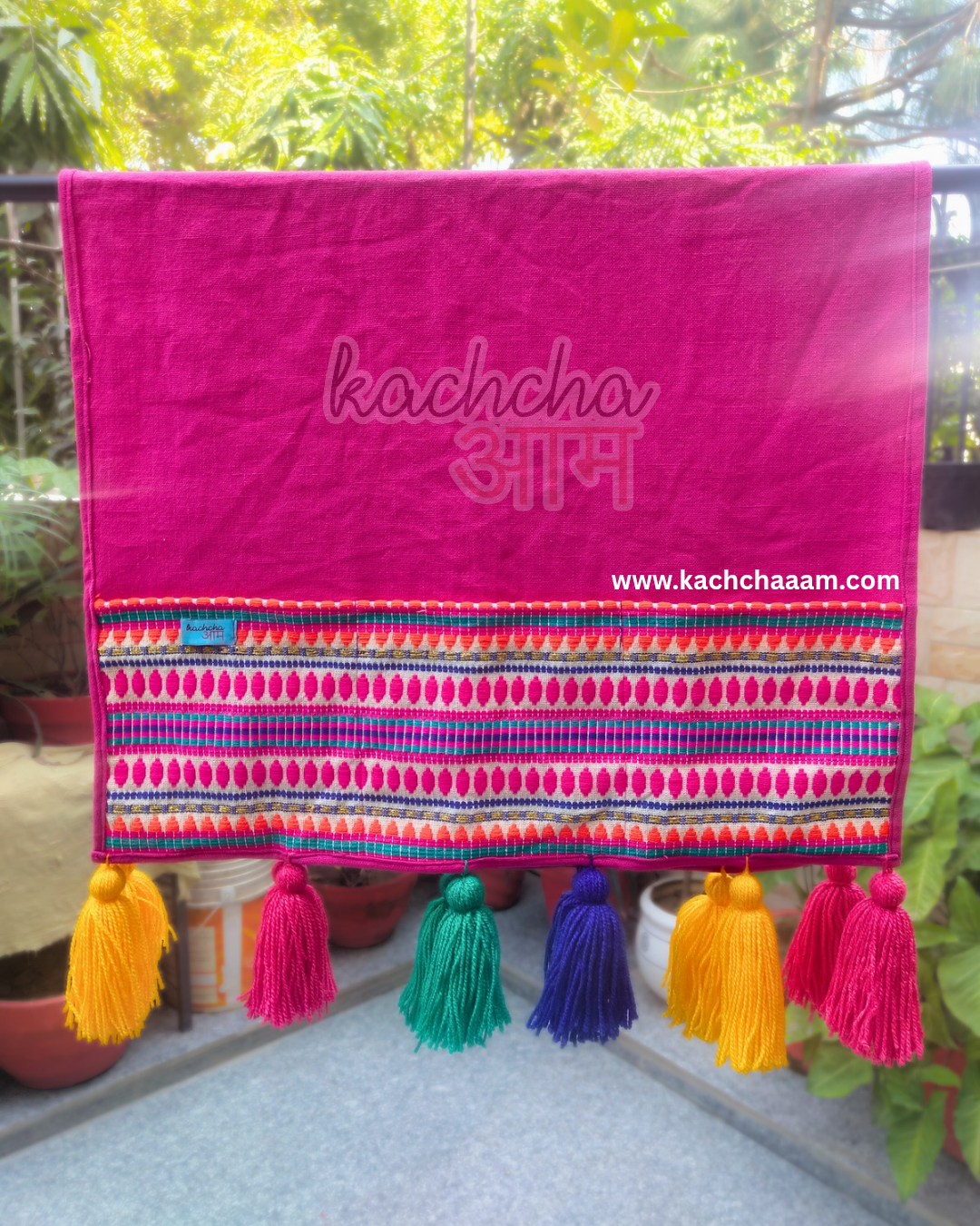 Magenta Cotton Slub Solid Fridge Cover with Magenta Jacquard Fabric Pockets & Multi Tassels